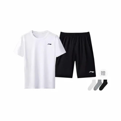 LiNing李宁 纯色圆领套头短袖T恤中腰短裤休闲运动套装 男款