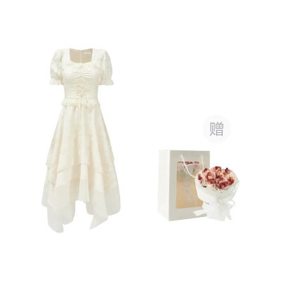 XUANSHU悬殊 法式方领白月光初恋公主裙复古宫廷风提花不规则裙边泡泡袖蕾丝边绑带收腰短袖连衣裙 女款 杏色 520限定赠玫瑰花束+橱窗袋+暖灯